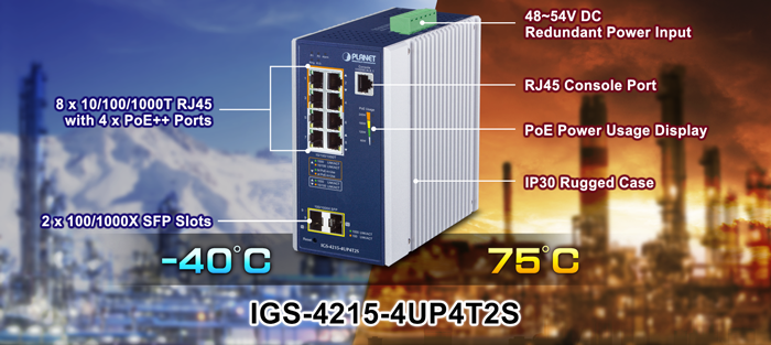 Designed to be installed in heavy industrial environments, the IGS-4215-4UP4T2S is the new member of PLANET Industrial-grade, DIN-rail type L2/L4 Managed Gigabit PoE++ Switch family featuring PLANET intelligent PoE functions to improve the availability of critical business applications. It provides IPv6/IPv4 dual stack management and built-in L2/L4 Gigabit switching engine along with 4 10/100/1000BASE-T ports featuring 95-watt 802.3bt PoE++, 4 additional Gigabit copper ports and another 2 extra 100/1000BASE-X SFP fiber slots for data and video uplink. The IGS-4215-4UP4T2S is able to operate reliably, stably and quietly in any hardened environment without affecting its performance. It comes with a total power budget of up to 240 watts for different kinds of PoE applications and operating temperature ranging from -40 to 75 degrees C in a rugged IP30 metal housing.