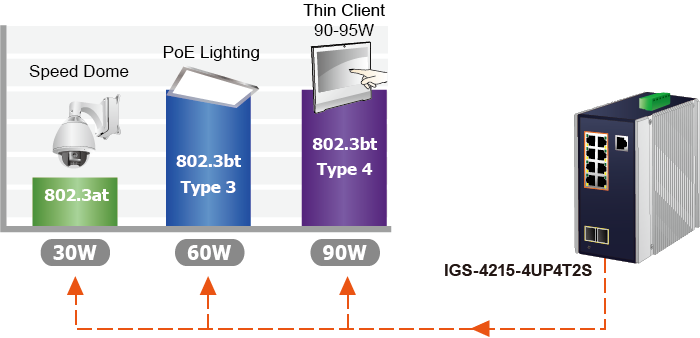 As the IGS-4215-4UP4T2S adopts the IEEE 802.bt PoE++ standard, it is capable to source up to 95 watts of power by using all the four pairs of standard Cat5e/6 Ethernet cabling to deliver power and full-speed data to each remote PoE compliant powered device (PD). It possesses triple amount of power capability than the conventional 802.3at PoE+ and is an ideal solution to satisfy the growing demand for higher power consuming network PDs, such as: