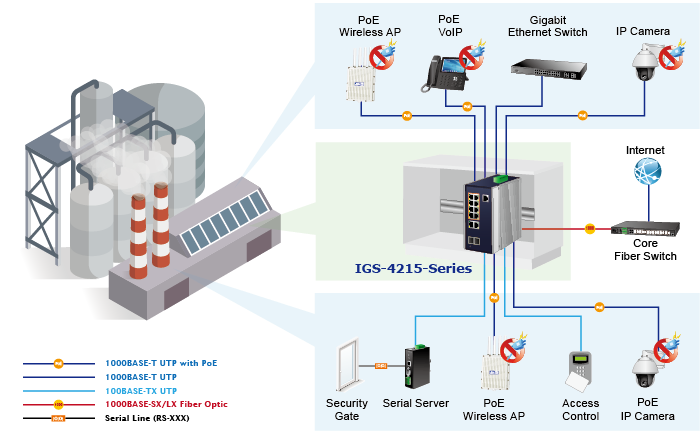 The IGS-4215-4UP4T2S provides 4 extra Gigabit TP interfaces supporting 10/100/1000BASE-T RJ45 copper to connect with surveillance network devices such as NVR, Video Streaming Server or NAS to facilitate surveillance management. Or through the two dual-speed fiber SFP slots, it can also connect with the 100BASE-FX /1000BASE-SX/LX SFP (Small Form-factor Pluggable) fiber transceiver to uplink to backbone switch and monitoring center in long distance. The distance can be extended from 550 meters to 2 kilometers (multi-mode fiber) and to 10/20/40/60/80/120 kilometers (single-mode fiber or WDM fiber). They are well suited for applications within the enterprise data centers and distributions.