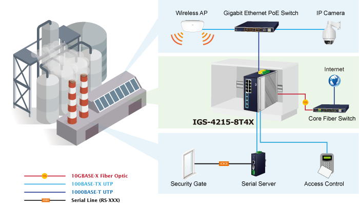 • product_editor_4418_tab_content: <strong>Industrial-grade Switch for Security and Automation</strong> The IGS-4215-8T4X, featuring four high-speed Gigabit Ethernet interfaces, is ideal for security-focused environments. It efficiently manages IP phone systems, surveillance setups, and wireless access points in harsh industrial settings. <img style="display: block; margin-left: auto; margin-right: auto;" src="https://www.planet.com.sa/planet-storage/2025/01/IGS-4215-8UP4X_8T4X-6.png" alt="" width="700" height="395" /> <strong>Model that Withstands Harsh Operation and Extends Distance</strong> The IGS-4215-8T4X is made to withstand any harsh operation in such environments as traffic control cabinets, factory floors, and indoor and outdoor locations where temperatures are extremely high or low. With a non-blocking design and compact size, the installation of the IGS-4215-8T4X is easy and helpful to build a Gigabit high-bandwidth switched network quickly. <img style="display: block; margin-left: auto; margin-right: auto;" src="https://www.planet.com.sa/planet-storage/2025/01/IGS-4215-8UP4X_8T4X-5.png" alt="" width="700" height="431" />