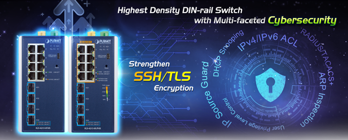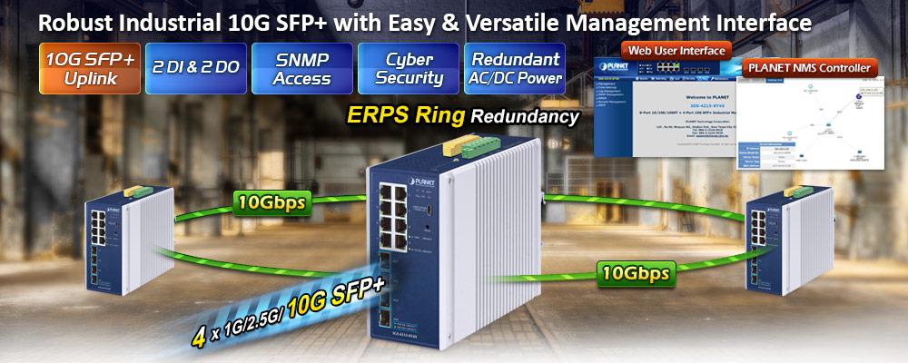 • product_editor_4421_tab_content: <strong>Physical Port</strong> <ul> <li><strong>8 10/100/1000BASE-T</strong> Gigabit Ethernet RJ45 ports</li> <li><strong>4 10GBASE-SR/LR SFP+</strong> slots, backward compatible with<strong> 100M/1G/2.5GBASE-X SFP </strong></li> <li>One USB Type C console interface for basic management and setup</li> </ul>   <strong>Industrial Case and Installation</strong> <ul> <li>IP30 aluminum case</li> <li>DIN-rail and wall-mount designs</li> <li>9~48V DC, redundant power with reverse polarity protection</li> <li>24V AC, 0.8A (max.)</li> <li>Supports 6KV DC Ethernet ESD protection</li> <li>-40 to 75 °C operating temperature</li> </ul>   <strong>Digital Input and Digital Output</strong> <ul> <li>2 digital input (DI)</li> <li>2 digital output (DO)</li> <li>Integrate sensors into auto alarm system</li> <li>Transfer alarm to IP network via SNMP trap</li> </ul>   <strong>Switching</strong> <ul> <li>Hardware-based 10/100Mbps (half/full duplex), 1000Mbps (full duplex), auto-negotiation and auto MDI/MDI-X</li> <li>IEEE 802.3x flow control for full duplex operation and back pressure for half duplex operation</li> <li>16K MAC address table size</li> <li>12K jumbo frame</li> <li>Automatic address learning and address aging</li> </ul>   <strong>Layer 2 Features</strong> <ul> <li>Supports <strong>VLAN</strong> <ul> <li>IEEE 802.1Q tagged VLAN</li> <li>Provider bridging (VLAN Q-in-Q, IEEE 802.1ad) support</li> <li>Protocol VLAN</li> <li>Voice VLAN</li> <li>Private VLAN (Protected port)</li> <li>Management VLAN</li> <li>GVRP</li> </ul> </li> <li>Supports <strong>Spanning Tree Protocol</strong> <ul> <li>STP (Spanning Tree Protocol)</li> <li>RSTP (Rapid Spanning Tree Protocol)</li> <li>MSTP (Multiple Spanning Tree Protocol)</li> <li>STP BPDU Guard, BPDU Filtering and BPDU Forwarding</li> </ul> </li> <li>Supports <strong>Link Aggregation</strong> <ul> <li>IEEE 802.3ad Link Aggregation Control Protocol (LACP)</li> <li>Cisco ether-channel (static trunk)</li> <li>Maximum 8 trunk groups, up to 8 ports per trunk group</li> </ul> </li> <li>Supports port mirror (many-to-1)</li> <li>Loop protection to avoid broadcast loops</li> <li>Supports ERPS (Ethernet Ring Protection Switching)</li> <li>Link Layer Discovery Protocol (LLDP)</li> </ul>   <strong>Quality of Service</strong> <ul> <li>Ingress/Egress Rate Limit per port bandwidth control</li> <li>Traffic classification <ul> <li>IEEE 802.1p CoS</li> <li>TOS/DSCP/IP precedence of IPv4/IPv6 packets</li> </ul> </li> <li>Strict priority and Weighted Round Robin (WRR) CoS policies</li> </ul>   <strong>Multicast</strong> <ul> <li>Supports IPv4 IGMP snooping v2, v3</li> <li>Supports IPv6 MLD snooping v1, v2</li> <li>IGMP querier mode support</li> <li>IGMP snooping port filtering</li> <li>MLD snooping port filtering</li> </ul>   <strong>Security</strong> <ul> <li>Storm Control support <ul> <li>Broadcast / Multicast / Unknown Unicast</li> </ul> </li> <li>Authentication <ul> <li>Built-in RADIUS client to cooperate with the RADIUS servers</li> <li>DHCP Option 82</li> <li>RADIUS/TACACS+ authentication</li> </ul> </li> <li>Access Control List <ul> <li>IPv4/IPv6 IP-based ACL</li> <li>IPv4/IPv6 IP-based ACE</li> <li>MAC-based ACL</li> <li>MAC-based ACE</li> </ul> </li> <li>MAC Security <ul> <li>Static MAC</li> <li>MAC filtering</li> </ul> </li> <li>Port security for source MAC address entries filtering</li> <li>DHCP snooping to filter distrusted DHCP messages</li> <li>Dynamic ARP inspection discards ARP packets with invalid MAC address to IP address binding</li> <li>IP source guard prevents IP spoofing attacks</li> <li>DoS attack prevention</li> </ul>   <strong>Management</strong> <ul> <li>IPv4 and IPv6 dual stack management</li> <li>Switch Management Interface <ul> <li>Web switch management</li> <li>Console/Telnet Command Line Interface</li> <li>SNMP v1 and v2c switch management</li> <li>SSHv2, TLSv1.2 and SNMP v3 secure access</li> </ul> </li> <li>SNMP Management <ul> <li>SNMP trap for interface Link Up and Link Down notification</li> <li>Four RMON groups (history, statistics, alarms and events)</li> </ul> </li> <li>User privilege levels control</li> <li>Built-in Trivial File Transfer Protocol (TFTP) client</li> <li>Static and DHCP for IP address assignment</li> <li>System Maintenance <ul> <li>Firmware upload/download via HTTP/TFTP</li> <li>Configuration upload/download through HTTP/TFTP</li> <li>Dual images</li> <li>Hardware reset button for system reboot or reset to factory default</li> </ul> </li> <li>SNTP Network Time Protocol</li> <li>Network Diagnostic <ul> <li>Cable diagnostics</li> <li>ICMPv6/ICMPv4 Remote Ping</li> <li>SFP-DDM (Digital Diagnostic Monitor)</li> </ul> </li> <li>Link Layer Discovery Protocol (LLDP) Protocol and LLDP-MED</li> <li>Event message logging to remote syslog server</li> <li>PLANET Smart Discovery Utility for deployment management</li> <li>PLANET NMS system and CloudViewer/CloudViewerPro for deployment management</li> </ul>