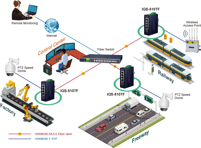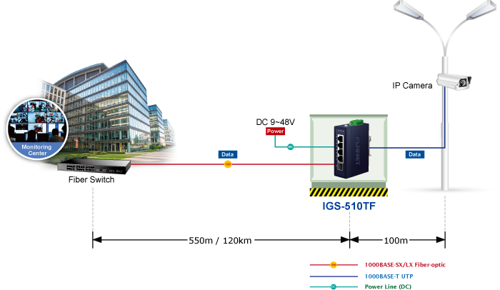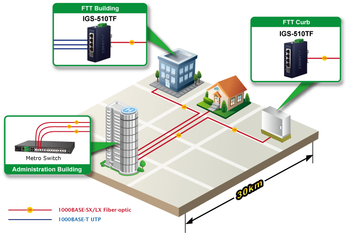 Thus, building a network solution of FTTH (Fiber to the Home), FTTC (Fiber to the Curb) for ISPs or FTTB (Fiber to the Building) for enterprises becomes so easy to users when long-distance deployment is employed. The IGS-510TF can handle extremely large amounts of data in a secure topology linking to a metro switch, backbone or high-capacity server.