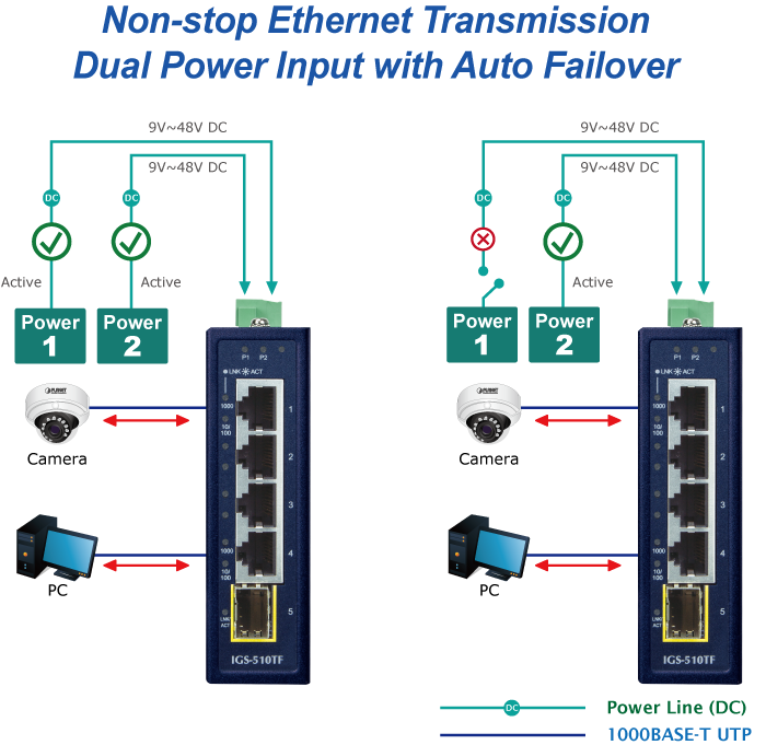 The IGS-510TF features a strong dual power input system with wide-ranging voltages (9V~48V DC or 24V AC) incorporated into customer’s automation network to enhance system reliability and uptime. In the example below, when power supply 1 fails to work, the hardware failover function will be activated automatically to keep powering the IGS-510TF via power supply 2 alternatively without any loss of operation.