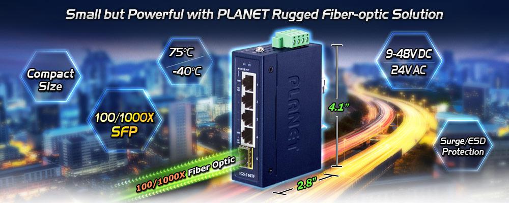 PLANET IGS-510TF is an industrial-grade Gigabit Ethernet Switch, featuring four 10/100/1000BASE-T copper ports and one 100/1000BASE-X SFP fiber port and packed in an IP30-rated rugged but compact-size case. Being able to operate under the temperature ranging from -40 to 75 degrees C and a wide-ranging redundant power system (9~48V DC or 24V AC), the IGS-510TF provides reliable, stable and continuous long-range data transmission and can be installed in any harsh environment without taking space into consideration.