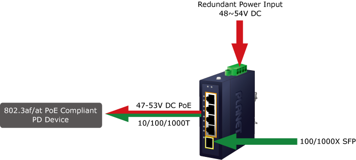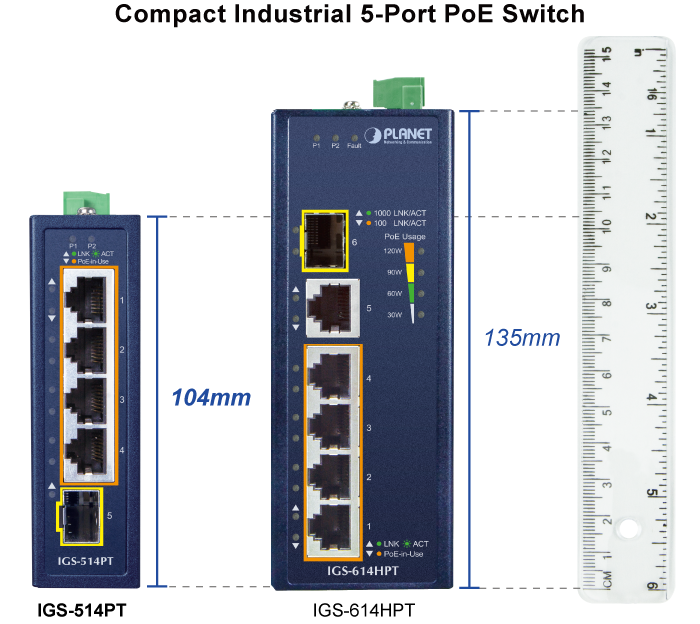PLANET IGS-514PT is the smallest industrial-grade 4-Port PoE+ Switch in PLANET industrial PoE product lineup and is specially designed to be installed in a narrow environment. It provides up to 120-watt 802.3at PoE+ output capability and wire-speed Gigabit performance even in the harsh industrial environment. It comes with four 10/100/1000BASE-T 802.3at PoE+ ports and one 100/1000X SFP interface for uplink connection.