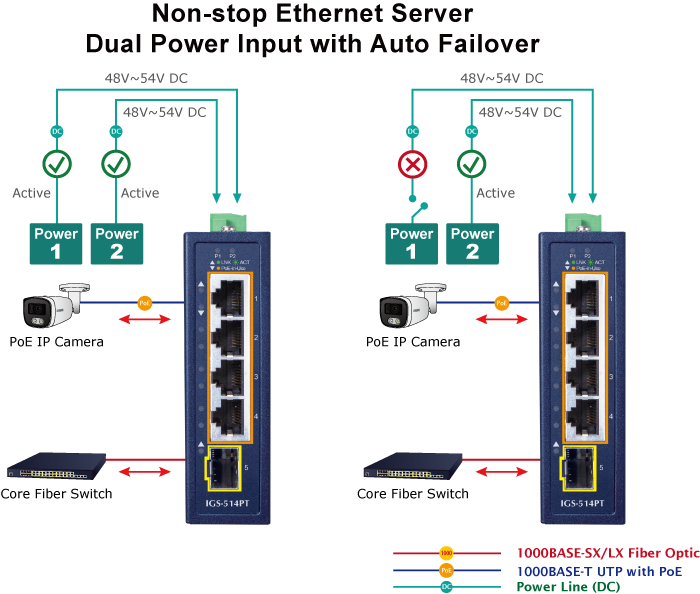The IGS-514PT features a strong dual power input system with wide-ranging voltages (48V~54V DC) incorporated into customer’s automation network to enhance system reliability and uptime. In the example below, when Power Supply 1 fails to work, the hardware failover function will be activated automatically to keep powering the IGS-514PT via Power Supply 2 without any break of operation.