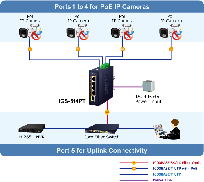 The maximum distance between two IP devices via Ethernet UTP cable is 100 meters. To flexibly extend the deployment range of IP devices, the IGS-514PT’s SFP slot supporting 100BASE-FX/1000BASE-X, SFP modules, and more can reach a transmission distance of up to 120km.