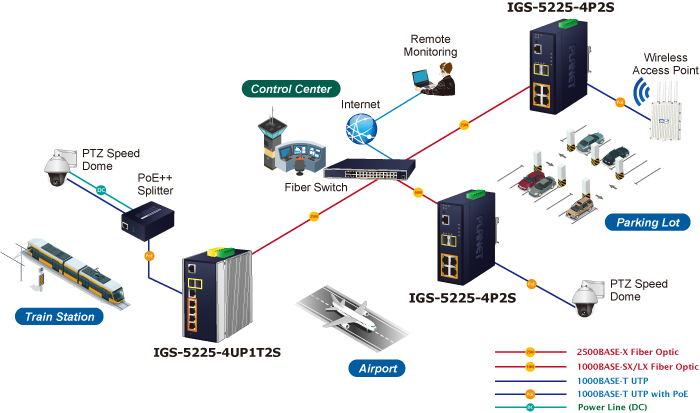 • applications_tab: <p><strong>Industrial Area Department/Workgroup PoE+ Switch</strong></p><p>Providing up to 4 802.3at PoE+, in-line power interfaces, the IGS-5225-4P2S can easily build a power centrally controlled for IP phone system, IP camera system, or wireless AP group for Industrial network. For instance, 4 PoE IP cameras or wireless access points can be easily installed around the corner in the industrial environment for surveillance demands or for a wireless roaming network. Without the power-socket limitation, the IGS-5225-4P2S makes the installation of IP cameras or wireless AP easier and more efficient.</p><p> <img style="display: block; margin-left: auto; margin-right: auto;" src="https://www.planet.com.sa/planet-storage/2025/01/IGS-5225-4P2Sv2-4.png" alt="" width="700" height="425"></p><p><strong>Gigabit 802.3at PoE+ IP Surveillance and Wireless LAN Service in Public Transportation</strong></p><p>With IEEE 802.3at Power over Ethernet standard, the IGS-5225-4P2S can directly connect with any third-party IEEE 802.3af/802.3at compliant devices like PTZ (Pan, Tilt & Zoom) IP cameras, PTZ speed dome cameras, color touch-screen Voice over IP (VoIP) telephones, and multi-channel wireless LAN access points. Wireless LAN would be more efficient for the transportation station to provide high speed and wide area Internet services for travelers. With the PoE wireless LAN structure, the transportation authority gains benefits from less cost while providing better Internet services in wider areas for the travelers.</p><p> </p><p><img style="display: block; margin-left: auto; margin-right: auto;" src="https://www.planet.com.sa/planet-storage/2025/01/IGS-5225-4P2Sv2-51.png" alt="" width="700" height="413"></p><p> </p>