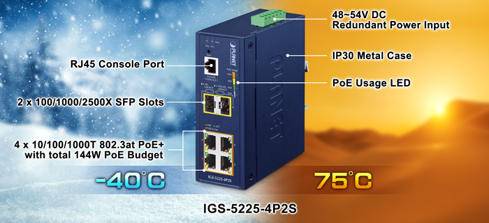 Being able to operate under wide temperature range from -40 to 75 degrees C, the IGS-5225-4P2S can be placed in almost any difficult environment. The IGS-5225-4P2S also allows either DIN-rail or wall mounting for efficient use of cabinet space.