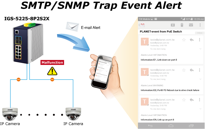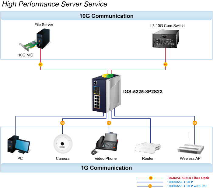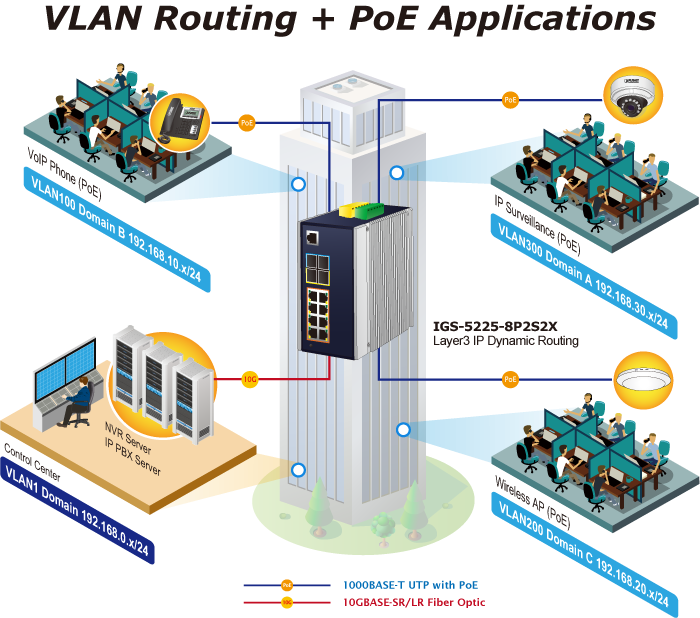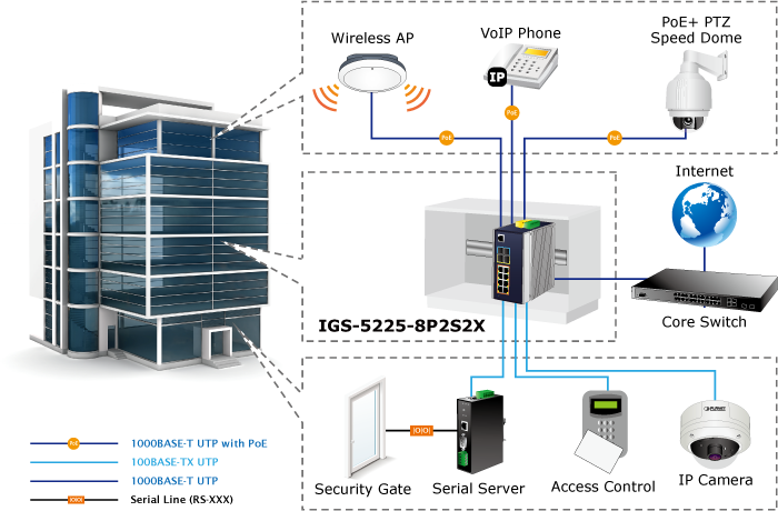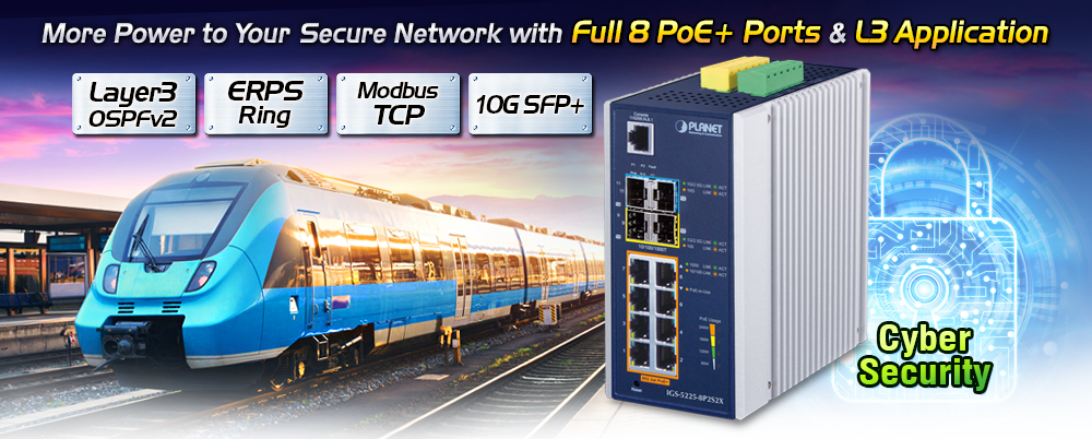 • applications_tab: <strong>Industrial Area Department/Workgroup PoE Switch</strong> Providing up to 8 PoE+, in-line power interfaces, the IGS-5225-8P2S2X can easily build a power centrally controlled for IP phone system, IP camera system, or wireless AP group for Industrial network. For instance, 8 PoE IP cameras or wireless access points can be easily installed around the corner in the industrial environment for surveillance demands or for a wireless roaming network. Without the power-socket limitation, the IGS-5225-8P2S2X makes the installation of IP cameras or wireless AP easier and more efficient.   <img style="display: block; margin-left: auto; margin-right: auto;" src="https://www.planet.com.sa/planet-storage/2025/01/IGS-5225-8P2S2Xv3-12.png" alt="" width="700" height="460" />   <strong>Excellent 10Gbps High Bandwidth Solution to Core Network</strong> The IGS-5225-8P2S2X performs 66Gbps non-blocking switch fabric, so it can easily provide a local 10Gbps high bandwidth Ethernet network for the backbone of your department. With the two built-in SFP+ ports, the IGS-5225-8P2S2X provides the uplink to the backbone network through the 10G Ethernet LR/SR SFP+ modules. It further improves the network efficiency and protects the network clients by offering the security and QoS features.   <img style="display: block; margin-left: auto; margin-right: auto;" src="https://www.planet.com.sa/planet-storage/2025/01/IGS-5225-8P2S2Xv3-13.png" alt="" width="700" height="620" /> <strong>Layer 3 VLAN Routing and 10G Uplink Application</strong> With the built-in, robust Layer 3 routing protocols, the IGS-5225-8P2S2X ensures reliable routing between VLANs and network segments. The routing protocols can be applied by VLAN interface with up to 32 routing entries. The IGS-5225-8P2S2X, certainly an ideal solution for industries, offers greater security, control and bandwidth conservation, and high-speed uplink.   <img style="display: block; margin-left: auto; margin-right: auto;" src="https://www.planet.com.sa/planet-storage/2025/01/IGS-5225-8P2S2Xv3-14.png" alt="" width="700" height="618" />
