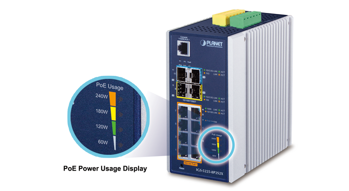 The IGS-5225-8P2S2X helps users to monitor current status of PoE power usage easily and efficiently by its advanced LED indication. The front panel of the Industrial Gigabit PoE+ Switch has four orange LEDs indicating 60W, 120W, 180W and 240W of PoE power usage.