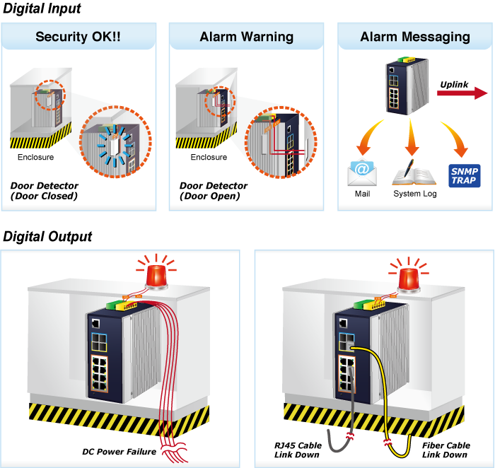 With a rugged IP30 metal case and wide temperature range from -40 to 75 degrees C, the IGS-5225-8P2S2X is able to stably operate in heavy Industrial demanding environments. Thus, the IGS-5225-8P2S2X provides a high level of immunity against electromagnetic interference and heavy electrical surges which are usually found on plant floors or in curbside traffic control cabinets. The IGS-5225-8P2S2X also allows either DIN-rail or wall mounting for efficient use of cabinet space.