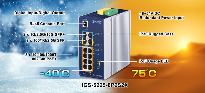 PLANET IGS-5225-8P2S2X is the smallest 10G uplink Layer 3 managed PoE switch preferably designed for industrial networks. Based on its 10Gbps big pipe connectivity to core networks, the IGS-5225-8P2S2X, equipped with 8 Gigabit ports featuring 36-watt 802.3at PoE+ and two 10Gbps SFP+ uplink slots, meets the demands of high power consumption and high bandwidth for 11ac Gigabit Wi-Fi APs and other PoE applications like those requiring heavy traffic loading.