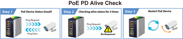The IGS-5225-8P2T4S can be configured to monitor connected PD’s status in real time via ping action. Once the PD stops working and responding, the IGS-5225-8P2T4S will recycle the PoE port power and bring the PD back to work. It also greatly enhances the reliability in that the PoE port will reset the PD power, thus reducing administrator’s management burden.