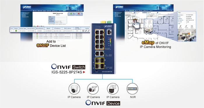 PLANET has developed an awesome feature — ONVIF Support — which is specifically designed for co-operating with video IP surveillances. From the IGS-5225-8P2T4S GUI, clients just need one click to search and show all of the ONVIF devices via network application. In addition, clients can upload floor images to the switch series making the deployments of surveillance and other devices easy for planning and inspection purposes. Moreover, clients can get real-time surveillance’s information and online/offline status; the PoE reboot can be controlled from the GUI.
