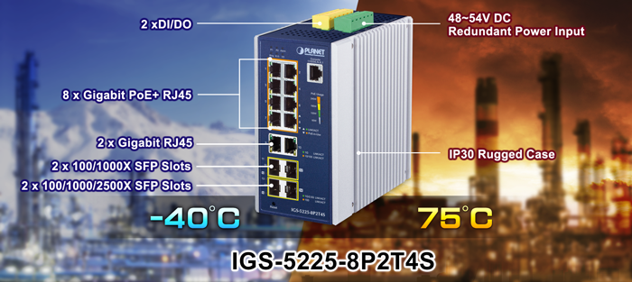 PLANET IGS-5225-8P2T4S PoE L2+Industrial Managed PoE+ Switch, featuring 8 10/100/1000BASE-T 802.3at PoE+ ports with each port powering up to 36 watts, two 10/100/1000BASE-T ports, two 100/1000 BASE-X SFP ports and two 100/1000/2500 BASE-X SFP ports in an IP30 rugged metal case, can be installed in any difficult environment. It provides user-friendly yet advanced IPv6/IPv4 management interfaces, abundant L2/L4 switching functions, Layer 3 static routing capability, and advanced ITU-G.8032 ERPS Ring technology to improve the rapid self-recovery capability and PLANET intelligent PoE functions for controlling the PoE outdoor IP surveillance and wireless network applications. It is able to operate reliably, stably and quietly in the temperature range from -40 to 75 degrees C.