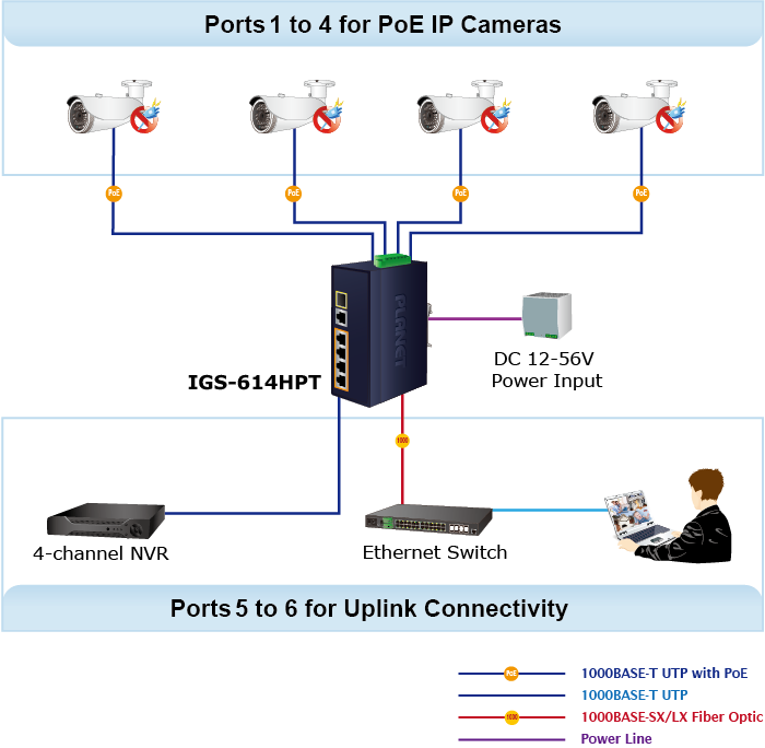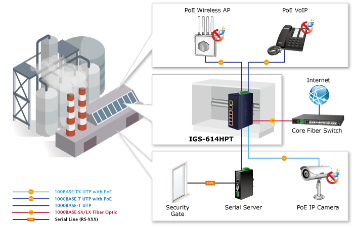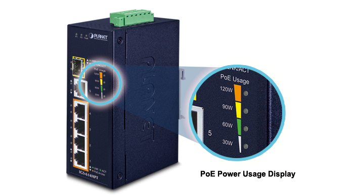 With Plug and Play design, PLANET IGS-614HPT Industrial-grade, DIN-rail type Unmanaged Gigabit Ethernet PoE+ Switch, featuring four IEEE 802.3at PoE+ 10/100/1000BASE-T ports, and one extra 10/100/1000BASE-T RJ45 copper port and one 100/1000BASE-X fiber optic interface for uplink connection, allows to automatically detect and configure internal and external peripherals.