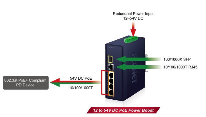 To facilitate the 802.3at PoE+ usage with commonly used 12~54V DC power input for transportation and industrial-level applications, the IGS-614HPT adopts 12~54V DC to 54V power boost technology to solve power source issue but does not require special power supplies. The IGS-614HPT provides an integrated power solution with a wide range of voltages (12~54V DC) for worldwide operability. It also provides dual-redundant, reversible polarity 12~54V DC power supply inputs for high availability applications