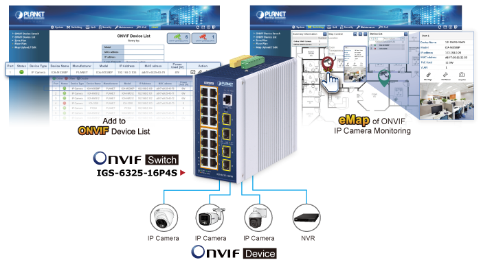 PLANET has newly developed an awesome feature — ONVIF Support — which is specifically designed for co-operating with video IP surveillances. From the IGS-6325-16P4S GUI, clients just need one click to search and show all of the ONVIF devices via network application. In addition, clients can upload floor images to the switch series, making the deployments of surveillance and other devices easy for planning and inspection purposes. Moreover, clients can get real-time surveillance’s information and online/offline status; the PoE reboot can be controlled from the GUI.