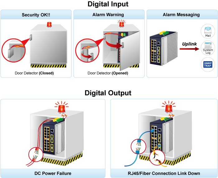 The IGS-6325 Series supports Digital Input and Digital Output on its upper panel. This external alarm enables users to use Digital Input to detect and log external device status (such as door intrusion detector), and send event alarm to the administrators. The Digital Output could be used to alarm the administrators if the IGS-6325 Series’ port shows link down, link up or power failure.