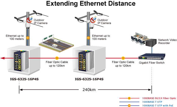 The additional four mini-GBIC slots built in the IGS-6325-16P4S support triple-speed 100/1000/2500BASE-X SFP (small form-factor pluggable) fiber-optic modules, meaning the administrator now can flexibly choose the suitable SFP transceiver according to not only the transmission distance but also the transmission speed required. The distance can be extended from 300 meters to 2 kilometers (multi-mode fiber) and 10/20/40/60/80/120 kilometers (single-mode fiber or WDM fiber). They are well suited for applications to uplink to backbone switch and monitoring center in long distance.