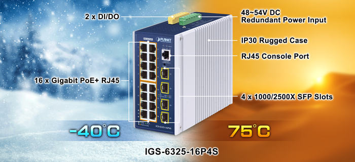 PLANET IGS-6325-16P4S L3 Industrial Managed PoE+ Switch boasts 16 10/100/1000BASE-T 802.3at PoE+ ports with each capable of providing up to 36 watts of power. Featuring a robust power budget of up to 360 watts, this switch ensures abundant power for all connected devices. In addition to its PoE+ ports, it comes equipped with 4 100/1000/2500BASE-X fiber ports, housed within a rugged IP30 metal case. This design not only enhances its durability but also makes it suitable for deployment in the most challenging settings. It features intuitive yet advanced IPv6/IPv4 management interfaces, empowering users with efficient control and configuration. Its feature-rich design includes a plethora of L2/L4 switching functions, Layer 3 OSPFv2/v3 dynamic routing capability, and cutting-edge ITU-T G.8032 ERPS Ring technology, ensuring seamless connectivity and rapid self-recovery in the event of network disruptions.