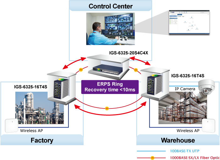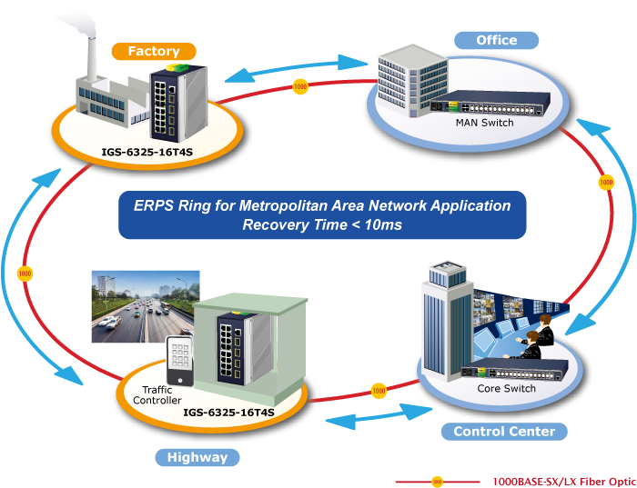 The IGS-6325-16T4S supports redundant ring technology and features strong, rapid self-recovery capability to prevent interruptions and external intrusions. It incorporates advanced ITU-T G.8032 ERPS (Ethernet Ring Protection Switching) technology, Spanning Tree Protocol (802.1s MSTP), and redundant power input system into customer’s industrial automation network to enhance system reliability and uptime in harsh factory environments. In a simple Ring network, the recovery time of data link can be as fast as 10ms.