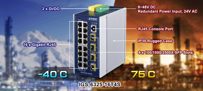 PLANET IGS-6325-16T4S is the smallest yet high-capacity, industrial-grade Layer 3 managed switch with high-density hybrid copper and fiber optic interfaces. It features 16 10/100/1000BASE-T RJ45 ports and 4 100/1000/ 2500BASE-X SFP slots in a DIN-rail type rugged case and can operate stably under the temperature range from -40 to 75 degrees C.