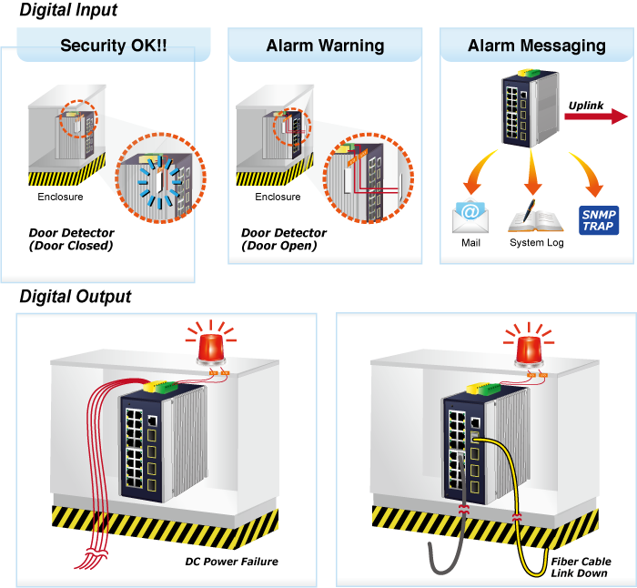 The IGS-6325-16T4S supports Digital Input and Digital Output on its front panel. This external alarm enables users to use Digital Input to detect and log external device status (such as door intrusion detector), and send event alarm to the administrators. The Digital Output could be used to alarm the administrators if the IGS-6325-16T4S port shows link down, link up or power failure.