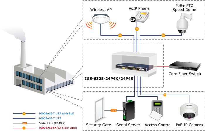 As the whole system comes with a total 440-watt PoE budget, the IGS-6325-24P4S is designed specifically to satisfy the growing demand of higher power consuming network PDs (powered devices) such as multi-channel (802.11a/b/g/n) wireless LAN access points, PTZ (pan, tilt, zoom) speed dome network cameras and other PoE network devices.