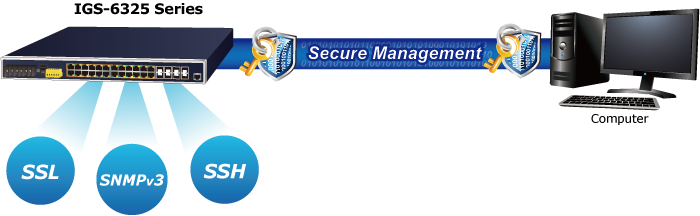 The IGS-6325 Series supports SSHv2, TLS and SSL protocols to provide strong protection against advanced threats. It includes a range of cybersecurity features such as DHCP Snooping, IP Source Guard, ARP Inspection Protection, 802.1x port-based and MAC-based network access control, RADIUS and TACACS+ user accounts management, SNMPv3 authentication, and so on to complement it as an all-security solution.