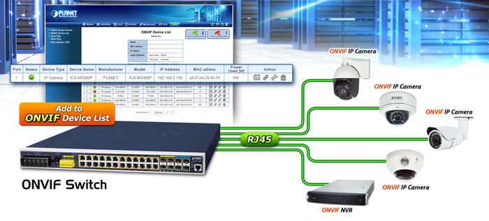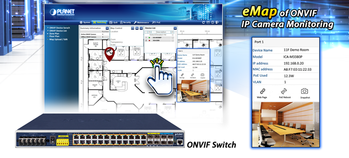 PLANET has newly developed an awesome feature — ONVIF Support — which is specifically designed for co-operating with video IP surveillances. From the IGS-6325-24P4S GUI, clients just need one click to search and show all of the ONVIF devices via network application. In addition, clients can upload floor images to the switch series, making the deployments of surveillance and other devices easy for planning and inspection purposes. Moreover, clients can get real-time surveillance’s information and online/offline status; the PoE reboot can be controlled from the GUI.