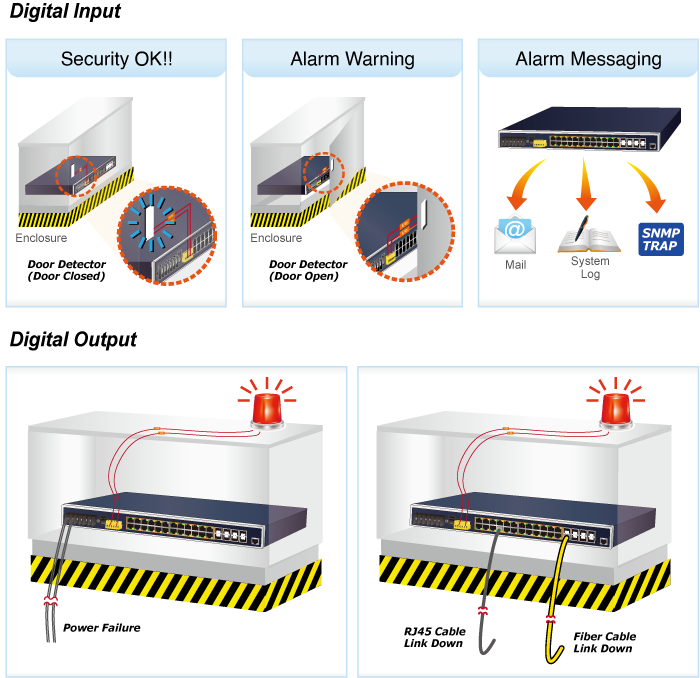 The IGS-6325 Series supports Digital Input and Digital Output on its upper panel. This external alarm enables users to use Digital Input to detect and log external device status (such as door intrusion detector), and send event alarm to the administrators. The Digital Output could be used to alarm the administrators if the IGS-6325 Series’ port shows link down, link up or power failure.