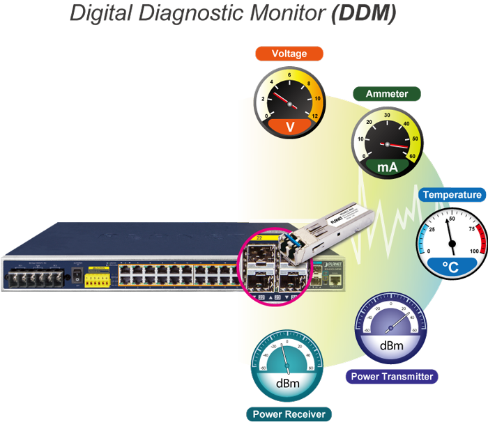 The IGS-6325 Series supports SFP-DDM (Digital Diagnostic Monitor) function that greatly helps network administrator to easily monitor real-time parameters of the SFP, such as optical output power, optical input power, temperature, laser bias current, and transceiver supply voltage.
