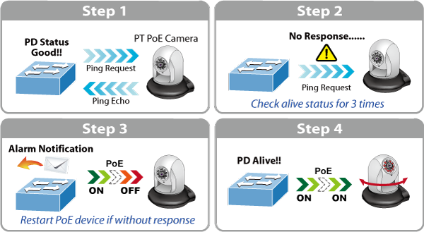 The IGS-6325-24P4S PoE Switch can be configured to monitor connected PD’s status in real time via ping action. Once the PD stops working and responding, the IGS-6325-24P4S will recycle the PoE port power and bring the PD back to work. It also greatly enhances the reliability in that the PoE port will reset the PD power, thus reducing administrator’s management burden.