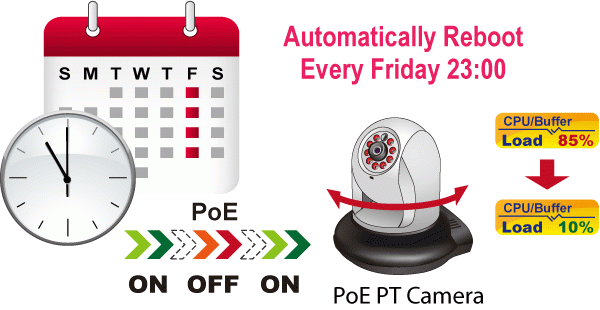 The IGS-6325-24P4S allows each of the connected PoE IP cameras or PoE wireless access points to reboot at a specific time each week. Therefore, it will reduce the chance of IP camera or AP crash resulting from buffer overflow.
