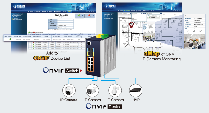 PLANET has newly developed an awesome feature — ONVIF Support — which is specifically designed for co-operating with video IP surveillances. From the IGS-6325 PoE++ Switch series GUI, clients just need one click to search and show all of the ONVIF devices via network application.