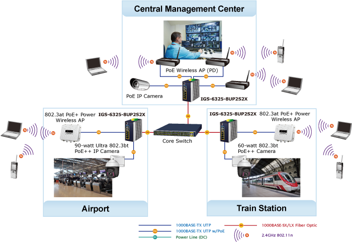 As the IGS-6325 PoE++ Series adopts the IEEE 802.bt PoE++ standard, it is capable to source up to 95 watts of power by using all the four pairs of standard Cat5e/6 Ethernet cabling to deliver power and full-speed data to each remote PoE compliant powered device (PD). It possesses triple amount of power capability than the conventional 802.3at PoE+ and is an ideal solution to satisfy the growing demand for higher power consuming network PDs, such as: