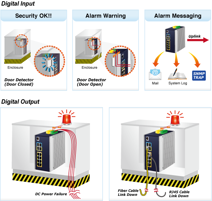 The IGS-6325 PoE++ Series supports Digital Input and Digital Output on its front panel. This external alarm enables users to use Digital Input to detect and log external device status (such as door intrusion detector), and send event alarm to the administrators. The Digital Output could be used to alarm the administrators if the I IGS-6325 PoE++ Series’ port shows link down, link up or power failure.