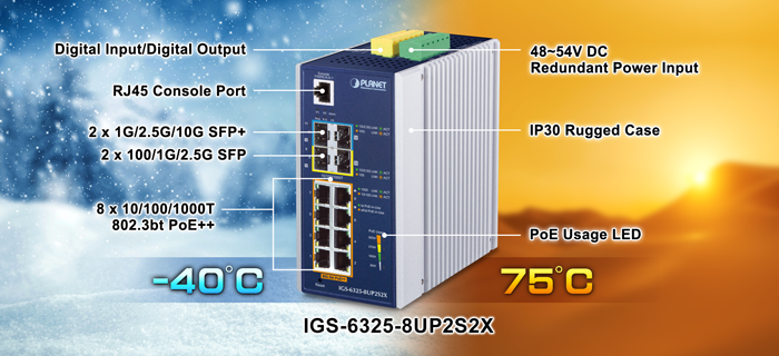 Complying with the IEEE 802.3bt Power over Ethernet Plus Plus technology, PLANET IGS-6325-8UP2S2X L3 Industrial Managed PoE++ Switch features eight 10/100/1000BASE-T 802.3bt PoE++ ports with each port powering up to 95 watts, two 10G SFP+ ports and two 100/1000/2500BASE-X SFP interfaces in a rugged IP30 metal case for stable operation in heavy industrial demanding environments. It supports rich PoE operation modes including 95-watt 802.3bt type-4 PoE++ ports, legacy PoE mode and 4-pair force mode to solve the incompatibility of non-standard 4-pair PoE PDs in the field.