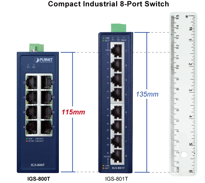 PLANET IGS-800T Compact Industrial 8-Port 10/100/1000T Gigabit Ethernet Switch, suitable for industrial use, features 8 1000Mbps auto-negotiation ports, IP30-rated rugged but compact case and a wide-ranging redundant power system (9~48V DC or 24V AC). The IGS-800T is able to operate in any harsh environment with operating temperature ranging from -40 to 75 degrees C.