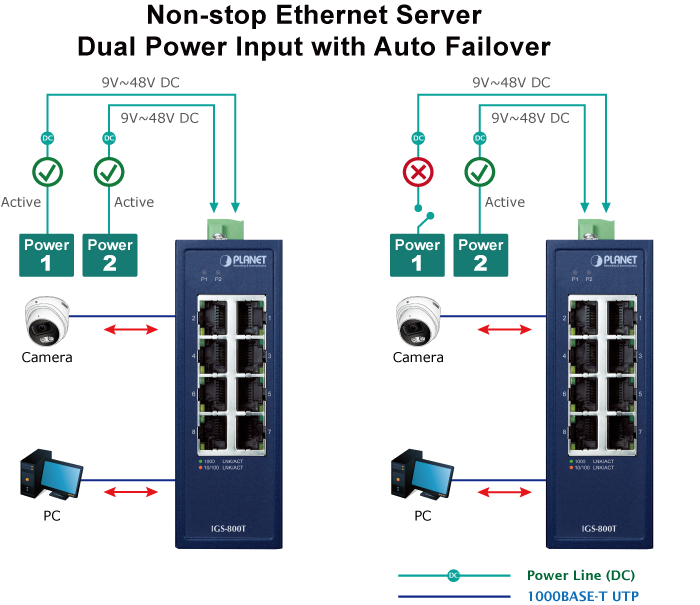 The IGS-800T features a strong dual power input system with wide-ranging voltages (9V~48V DC or 24V AC) incorporated into customer’s automation network to enhance system reliability and uptime. In the example below, when power supply 1 fails to work, the hardware failover function will be activated automatically to keep powering the IGS-800T via power supply 2 alternatively without any loss of operation.