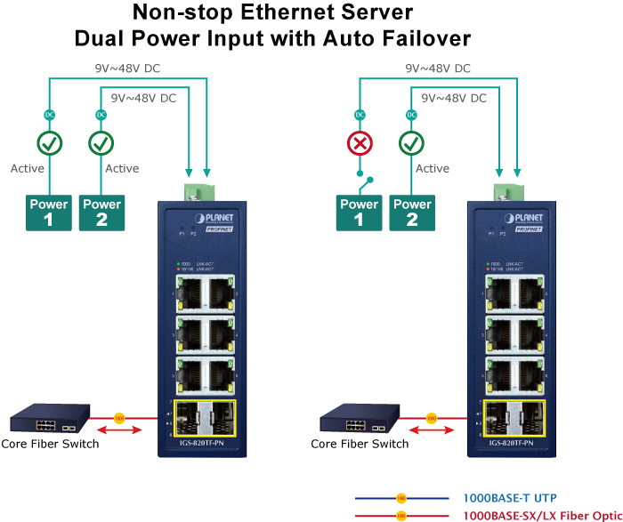 The IGS-820TF-PN features a strong dual power input system with wide-ranging voltages (9V~48V DC or 24V AC) to enhance system reliability and uptime in automation networks. For example, if power supply 1 fails, the hardware failover function is automatically activated to power the IGS-820TF-PN through power supply 2, ensuring uninterrupted operation.