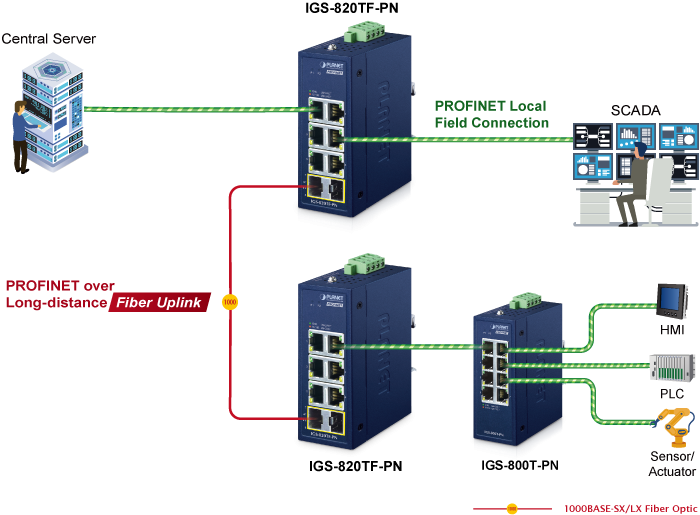 • applications_tab: <p class="pf0"><strong><span class="cf0">Reliable Industrial Networking for Automation and Monitoring</span></strong></p><p class="pf0"><span class="cf0">The IGS-820TF-PN is purpose-built for industrial environments that demand real-time data communication, simple deployment, and stable network performance. With its PROFINET traffic prioritization, dual Gigabit SFP uplinks, and compact rugged design, it is ideal for use in:</span></p><ul> <li class="pf0"><strong><span class="cf0">Factory Automation Systems</span></strong> <ul> <li class="pf0"><span class="cf0">Facilitates seamless communication between PLCs, HMIs, and industrial robots by ensuring time-sensitive control signals are delivered without delay.</span></li> </ul> </li> <li class="pf0"><strong><span class="cf0">Process Control in Manufacturing</span></strong> <ul> <li class="pf0"><span class="cf0">Integrates with sensors and actuators for precise monitoring and fast response in production lines.</span></li> </ul> </li> <li class="pf0"><strong><span class="cf0">Smart Transportation Infrastructure</span></strong> <ul> <li class="pf0"><span class="cf0">Supports reliable Ethernet communication for surveillance, signaling, and control systems in railway stations and tunnels.</span></li> </ul> </li> <li class="pf0"><strong><span class="cf0">Energy and Utility Monitoring</span></strong> <ul> <li class="pf0"><span class="cf0">Connects SCADA terminals, smart meters, and control units in substations, water treatment plants, and renewable energy sites.</span></li> </ul> </li> <li class="pf0"><strong><span class="cf0">Warehouse and Logistics Management</span></strong> <ul> <li class="pf0"><span class="cf0">Ensures stable and efficient communication for automated sorting systems, barcode readers, and tracking equipment.</span></li> </ul> </li> </ul><p class="pf0"><span class="cf0">With its plug-and-play setup, redundant power input, and fiber-optic uplink capability, the IGS-820TF-PN delivers dependable network connectivity in space-constrained and mission-critical environments.</span></p><p class="pf0"> </p><p class="pf0"><span class="cf0"><img style="display: block; margin-left: auto; margin-right: auto;" src="https://www.planet.com.sa/planet-storage/2025/12/IGS-820TF-PN-52.png" alt="" width="700" height="515"><br></span></p>