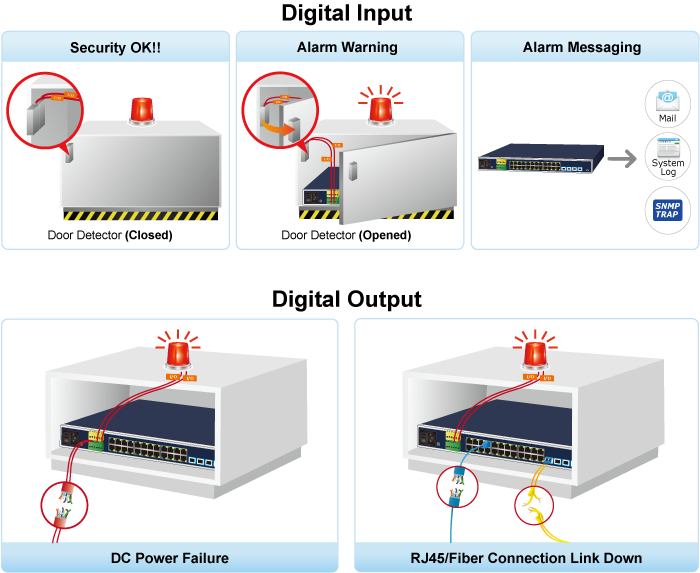 The IGS-R4215-24T4X supports Digital Input and Digital Output through a terminal block located on its front panel. This external alarm enables users to use Digital Input to detect and log external device status (such as door intrusion detector), and send event alarm to the administrators. The Digital Output could be used to alarm the administrators if the IGS-R4215-24T4X port shows link down, link up or power failure.