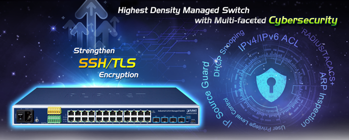 The IGS-R4215-24T4X supports SSHv2 and TLS protocols to provide strong protection against advanced threats. It includes a range of cybersecurity features such as DHCP Snooping, IP Source Guard, Dynamic ARP Inspection Protection, RADIUS and TACACS+ user accounts management, SNMPv3 authentication, and so on to complement it as an all-security solution.