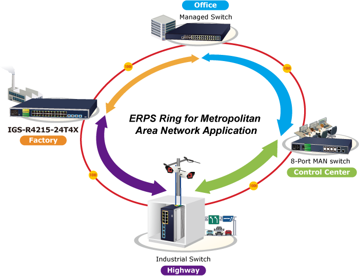 The IGS-R4215-24T4X supports redundant ring technology and features strong, rapid self-recovery capability to prevent interruptions and external intrusions. It incorporates advanced ITU-T G.8032 ERPS (Ethernet Ring Protection Switching) technology and Spanning Tree Protocol (802.1s MSTP) into customer’s network to enhance system reliability and uptime in harsh environments.