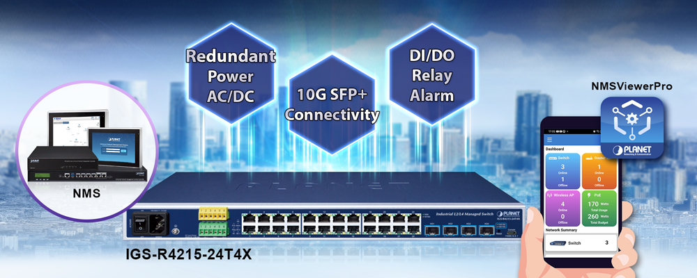 PLANET’s Universal Network Management System (UNI-NMS), NMSViewerPro and CloudViewerPro app provide robust support for IT staff in effectively managing and monitoring all network devices, including the IGS-R4215-24T4X, from remote locations. Tailored for deployment in both enterprises and industries where the IGS-R4215-24T4X is utilized remotely, these systems enable the identification of bugs or faulty conditions without the need for on-site visits. With PLANET’s Remote Management Solution, businesses of all types can now be swiftly and efficiently managed through a unified platform, streamlining operational oversight.