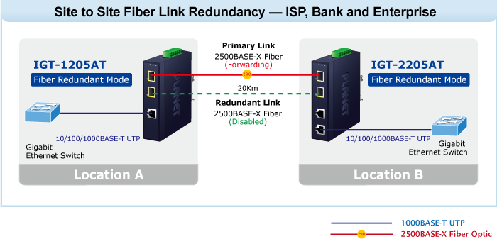 Via the built-in DIP switch, the two SFP fiber interfaces of the IGT-1205AT can be configured as Ethernet switch mode or fiber redundant mode. With the Ethernet switch mode, it can operate in Store-and-Forward mechanism with high performance; with the 2-port Fiber redundant mode, it provides rapid fiber redundancy of link for highly critical Ethernet applications. The redundant mode supports auto-recovering function. If the destination port of a packet is link-down, it will forward the packet to the other port of the backup pair.