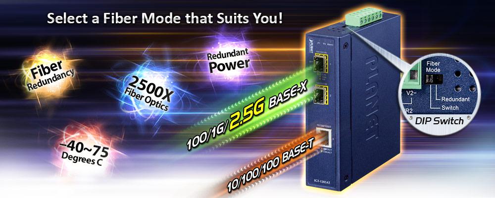Adjustable 3-port Switch Mode or 2-port Fiber Redundant Mode